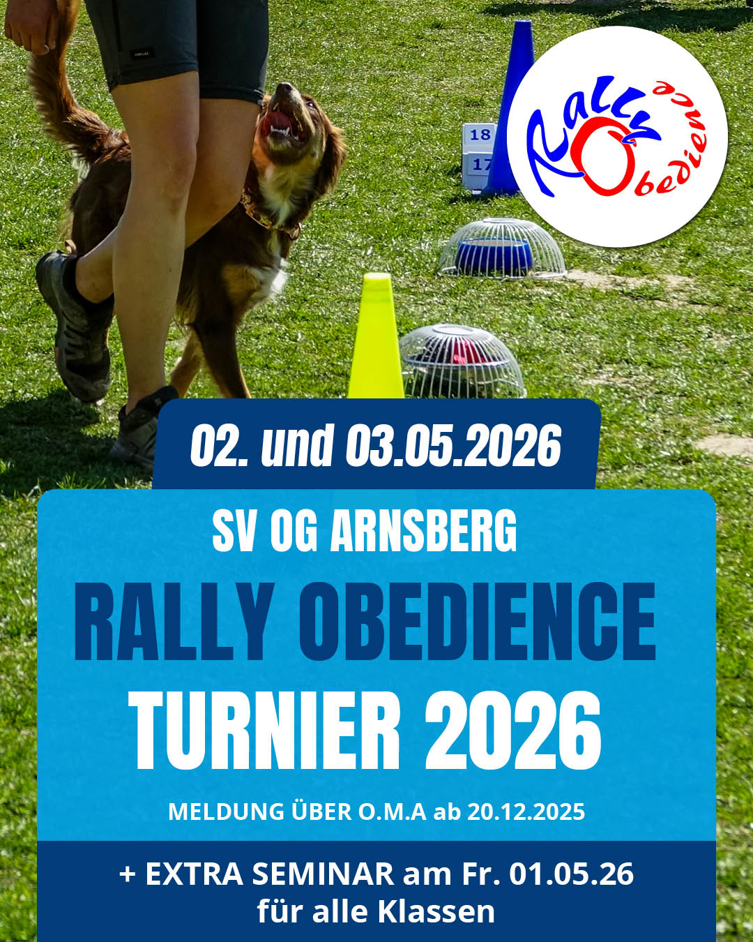 Die SV OG Arnsberg lädt zum 2. Rally-Obedience-Turnier ein. Das Turnier wird nach gültiger Prüfungsordnung durchgeführt und richtet sich an Rally-Obedience-Teams verschiedener Leistungsklassen.
